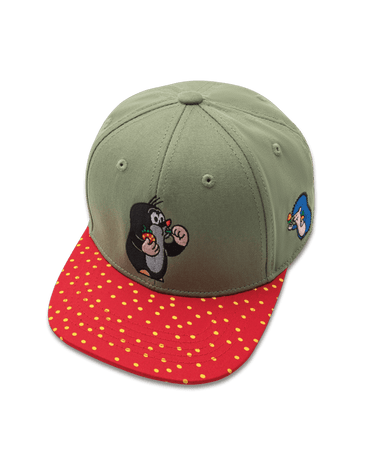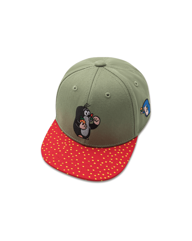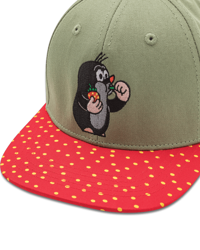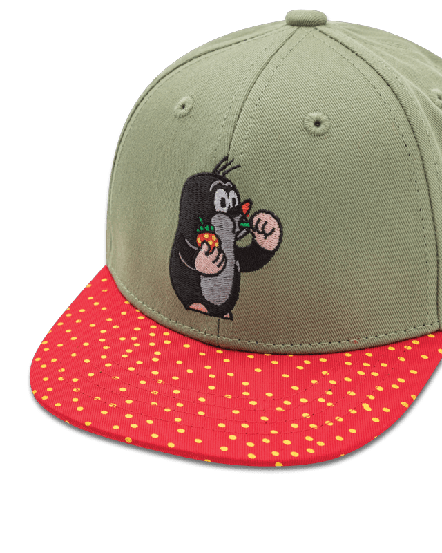 - Die Maulwurf "Erdbeere" Snapback in grün/rot mit dem kleinen Maulwurf vorne und seinem Freund, den Igel, an der Seite gestickt. Der Schirm erinnert mit seinem verzierten Druck an eine Erdbeere.